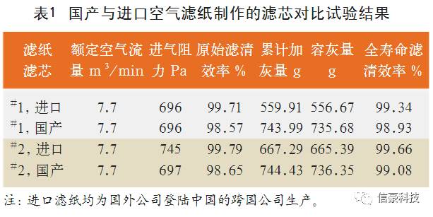 在此,僅以空氣濾紙的質量為例,反映國產濾紙與進口濾紙的質量差異。見表1。