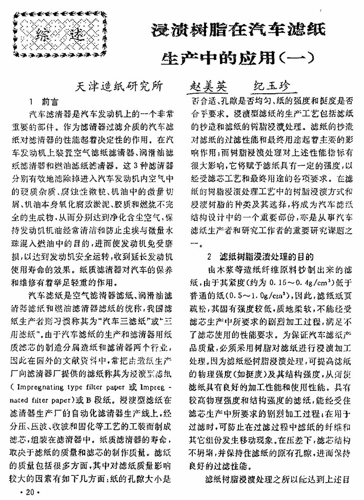 【摘要】:浸漬樹(shù)脂在汽車(chē)濾紙生產(chǎn)中的應(yīng)用,天津造紙研究所趙美英,紀(jì)玉珍,前言 汽車(chē)濾清器是汽車(chē)發(fā)動(dòng)機(jī)上的一個(gè)非常重要的部件。作為濾清器過(guò)濾介質(zhì)的汽車(chē)濾紙對(duì)濾清器的性能起著決定性的作用。在汽車(chē)發(fā)動(dòng)機(jī)上裝置空氣濾紙濾清器、潤(rùn)滑油濾紙濾清器和燃油濾紙濾清器。【作者單位】: 天津造紙研究所