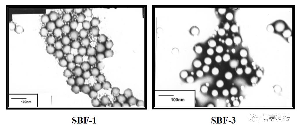 圖3為SBF-1和SBF-3的電鏡照片,從下圖中可以看出SBF-1乳液中乳膠粒子相對(duì)于SBF-3的乳膠粒子內(nèi)外反差更大,其核/殼結(jié)構(gòu)更為明顯,粒徑也更為均勻。