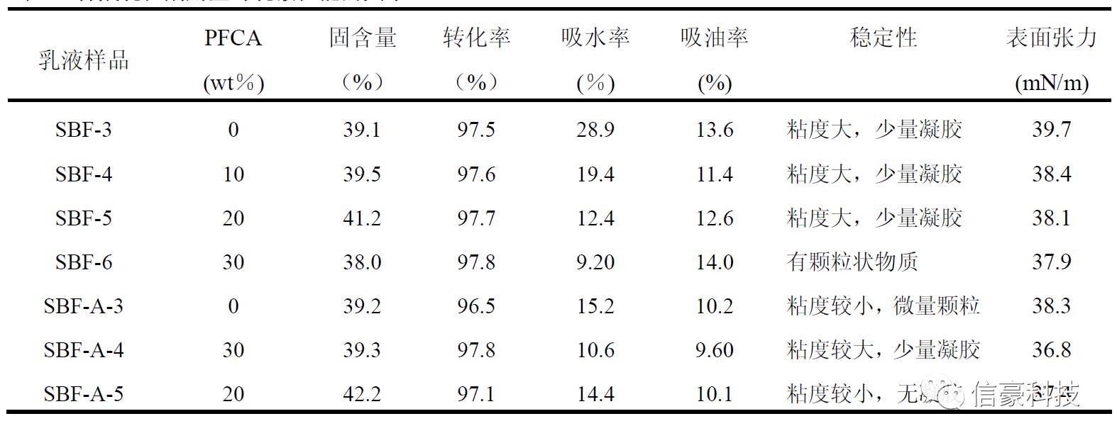 表3. 含氟單體種類與用量與乳液性能的關(guān)系