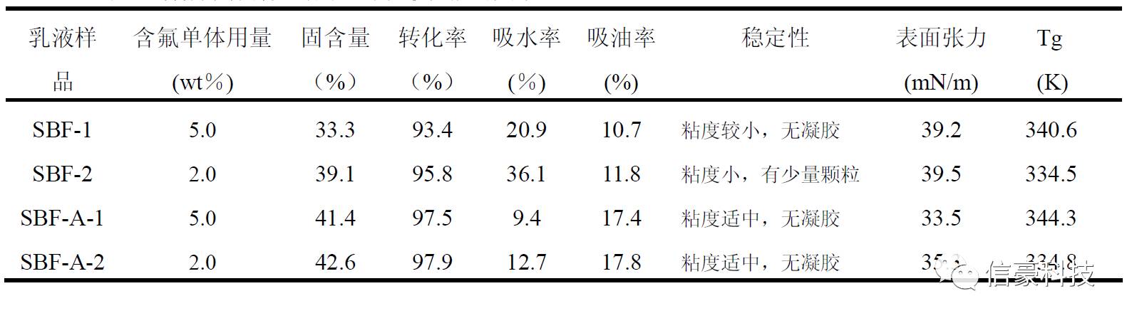 由上表可以看出,采用超聲預(yù)乳化工藝合成的乳液SBF-1的單體轉(zhuǎn)化率明顯高于采用常規(guī)單體加料方式所合成的乳液SBF-3。并且采用超聲預(yù)乳化工藝相對(duì)于單體直接滴加的工藝,前者可使共聚單體混合更加均勻,避免單體珠滴從水相體系中吸附乳化劑,從而提高乳液的穩(wěn)定性與共聚單體的轉(zhuǎn)化率。同時(shí),采用該種預(yù)乳化工藝合成的乳液,表面張力略低于后者,因此,其乳膠膜的抗水、抗油性較好。